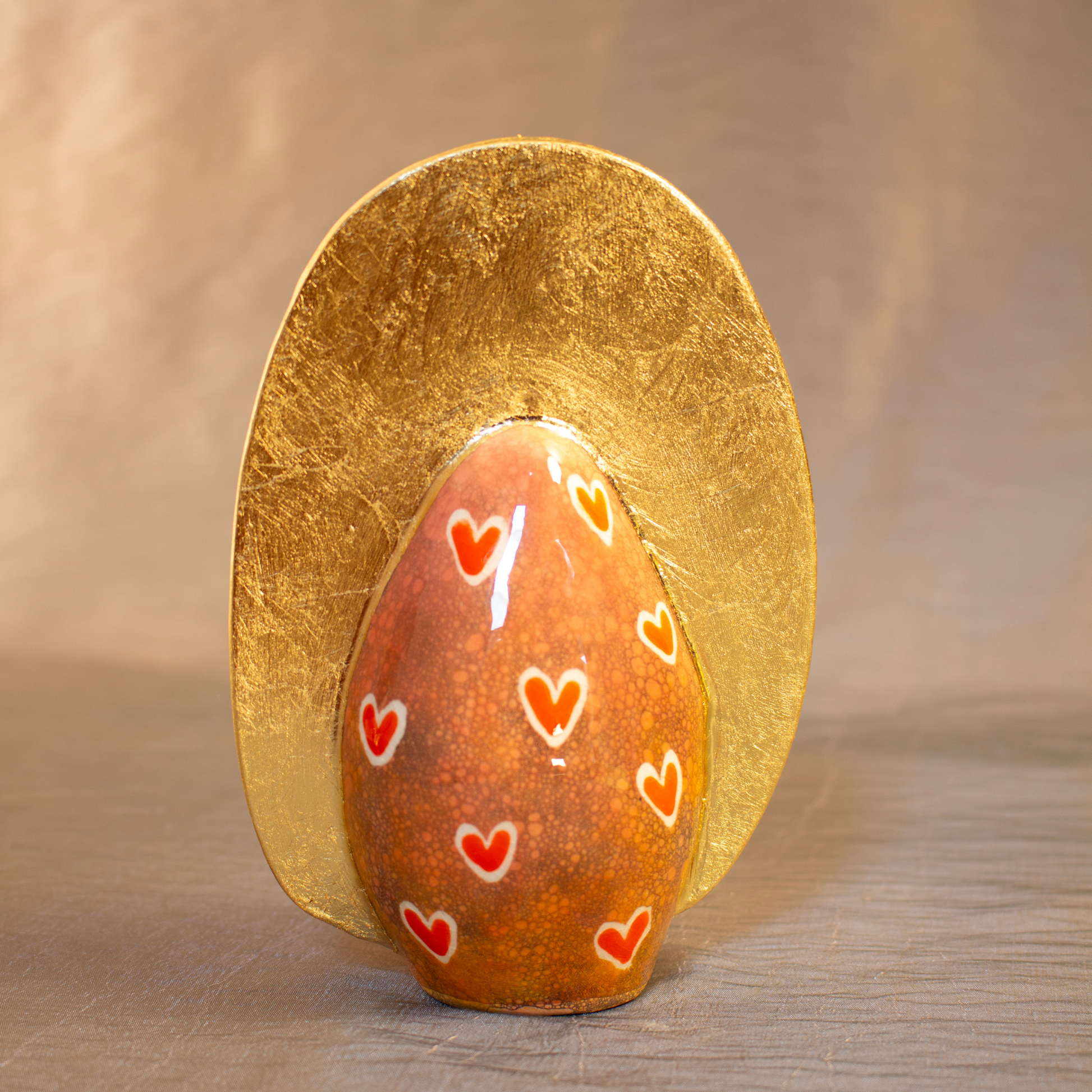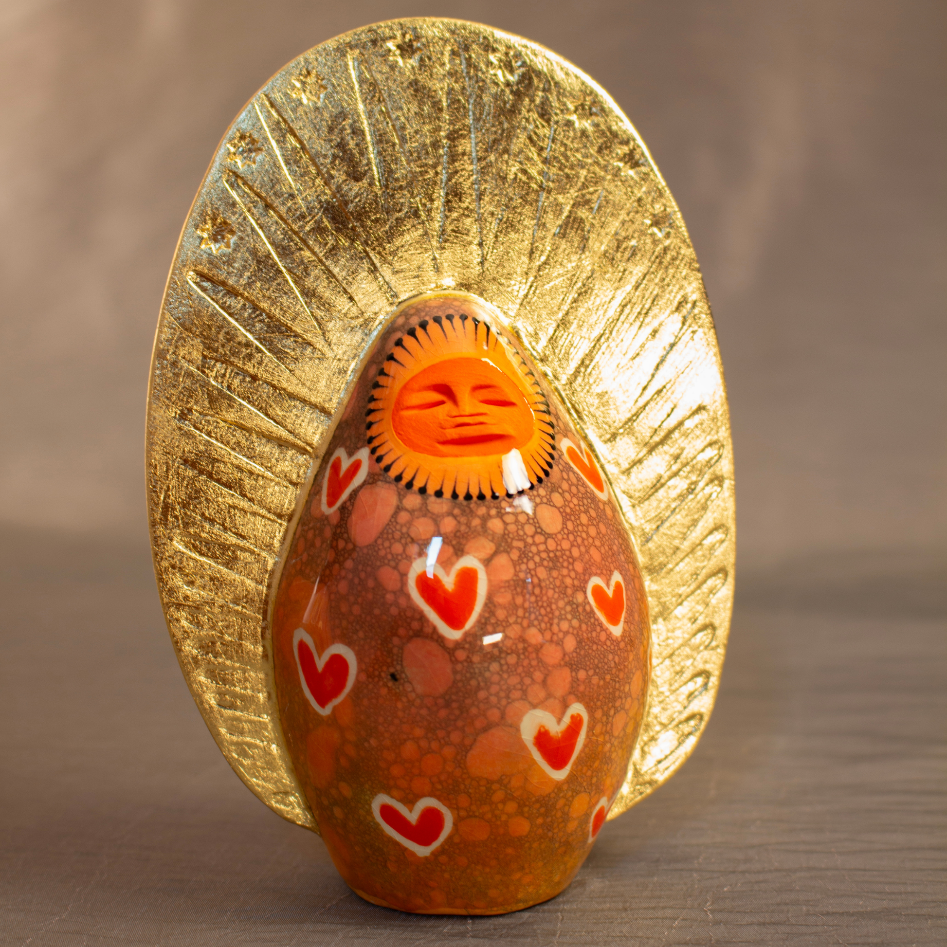 Hand painted ceramic Goddess with a deep orange face, black detailing and pink-orange ombre bubble glazed body with all over hearts pattern. Her crown has sun rays and tiny stars.