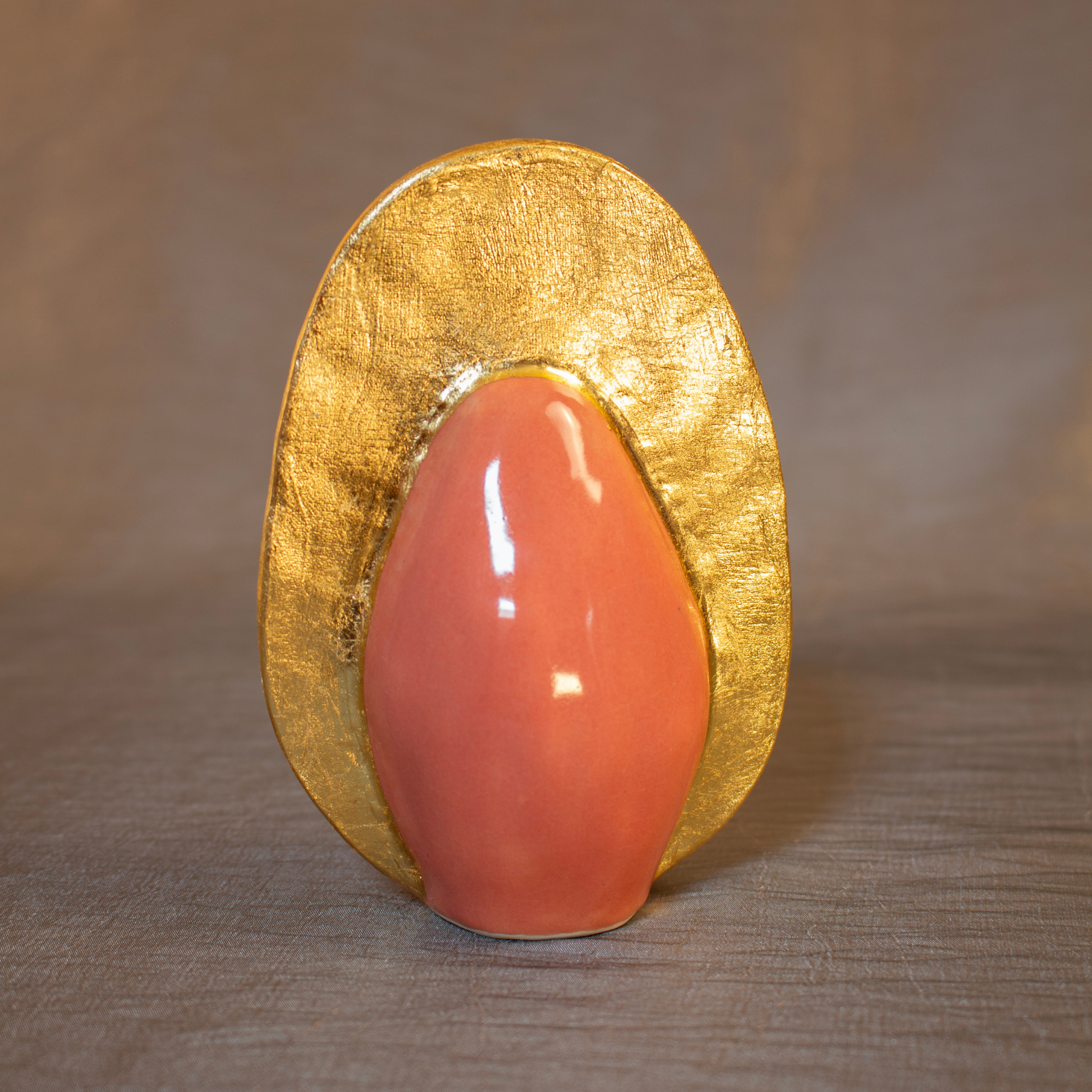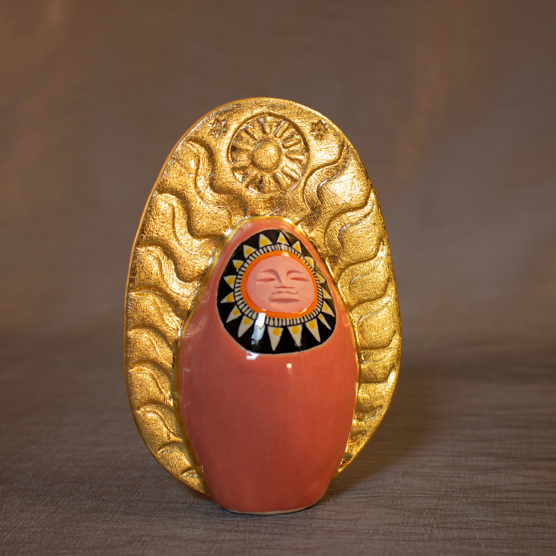 Hand painted ceramic Goddess with a pink face, black, yellow and white detailing and a deep pink glazed body. Her crown has a sunshine and sun ray pattern.