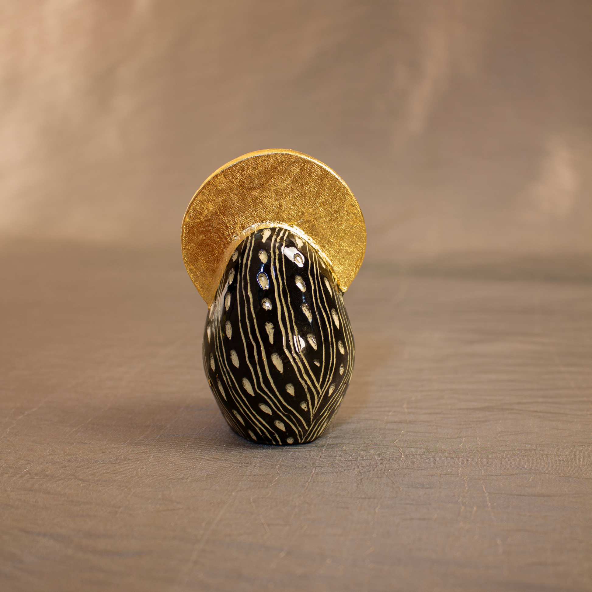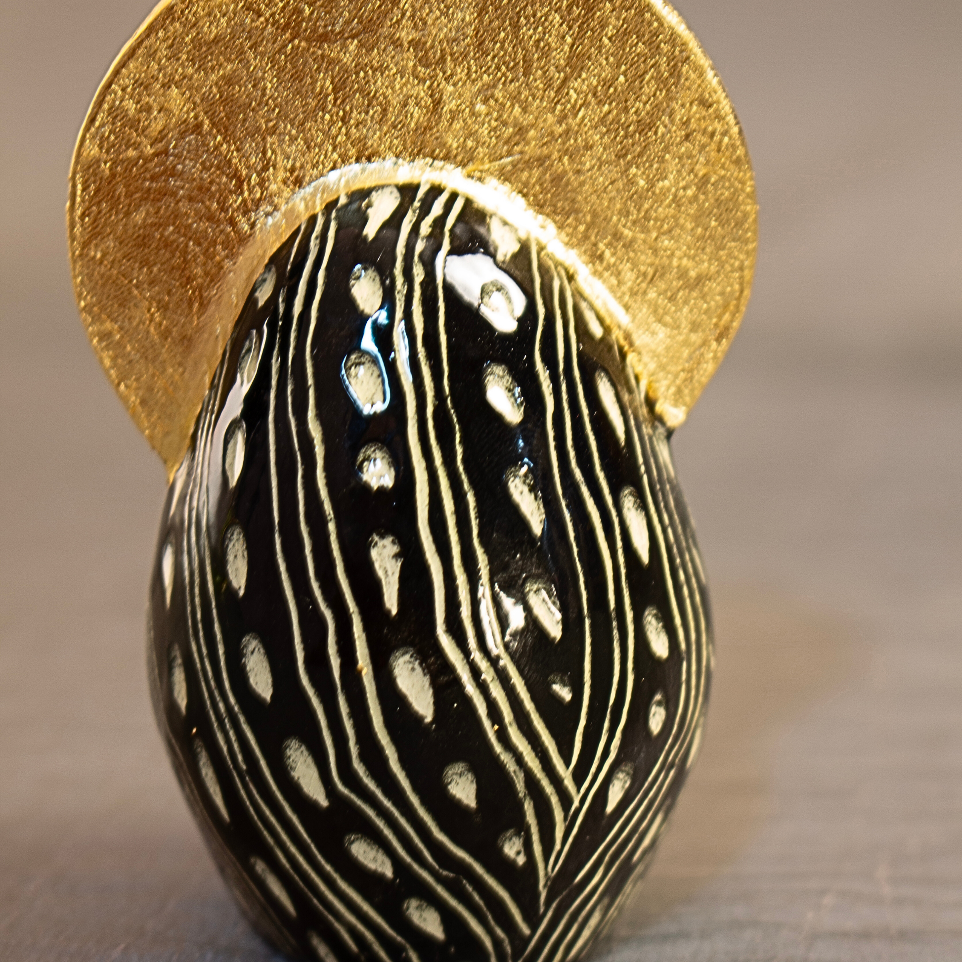 Ceramic Goddess with an all over black and white scgraffito pattern, her crown features three protective eyes.