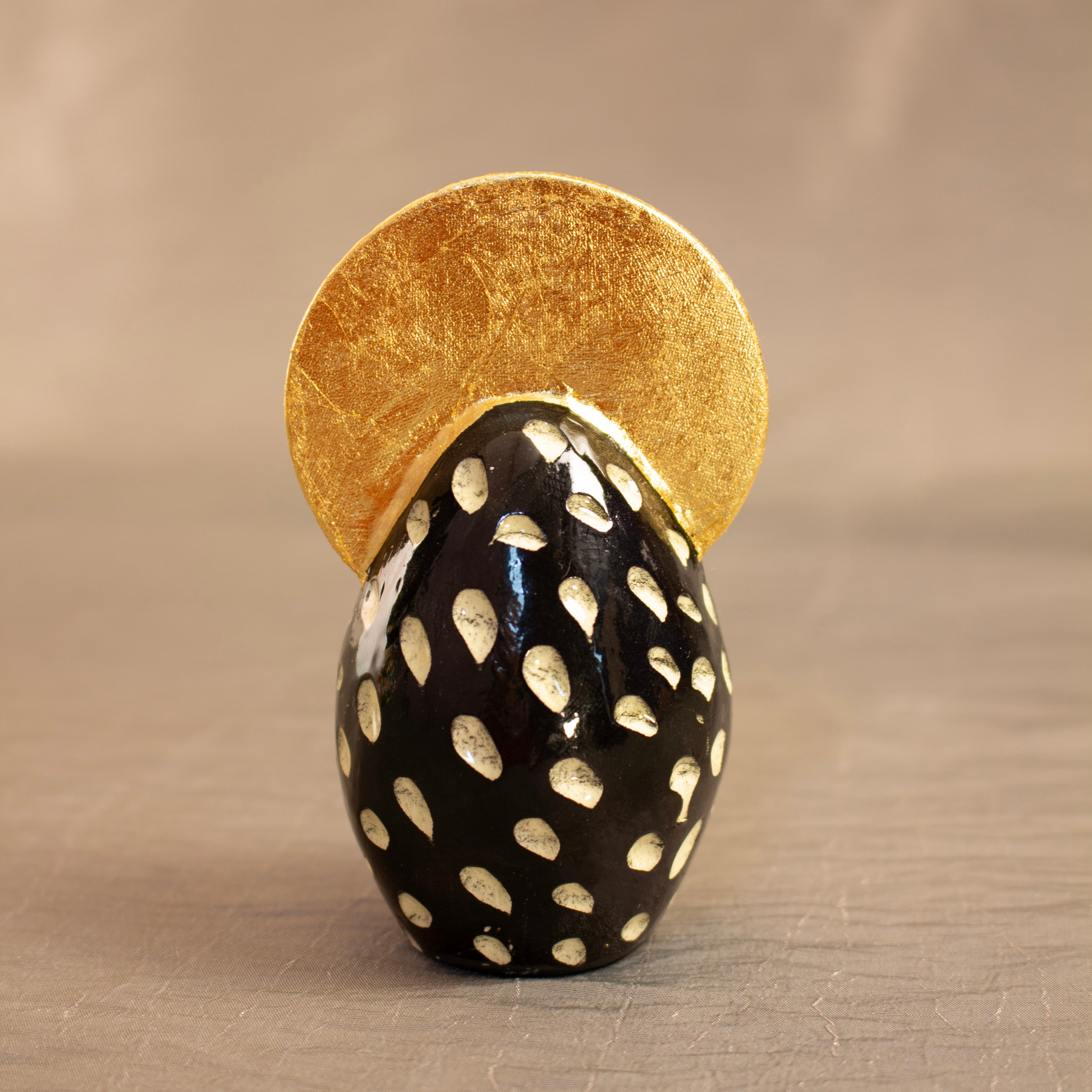 Ceramic Goddess with an all over black and white scgraffito pattern, her crown features a sun and two sage leaves.