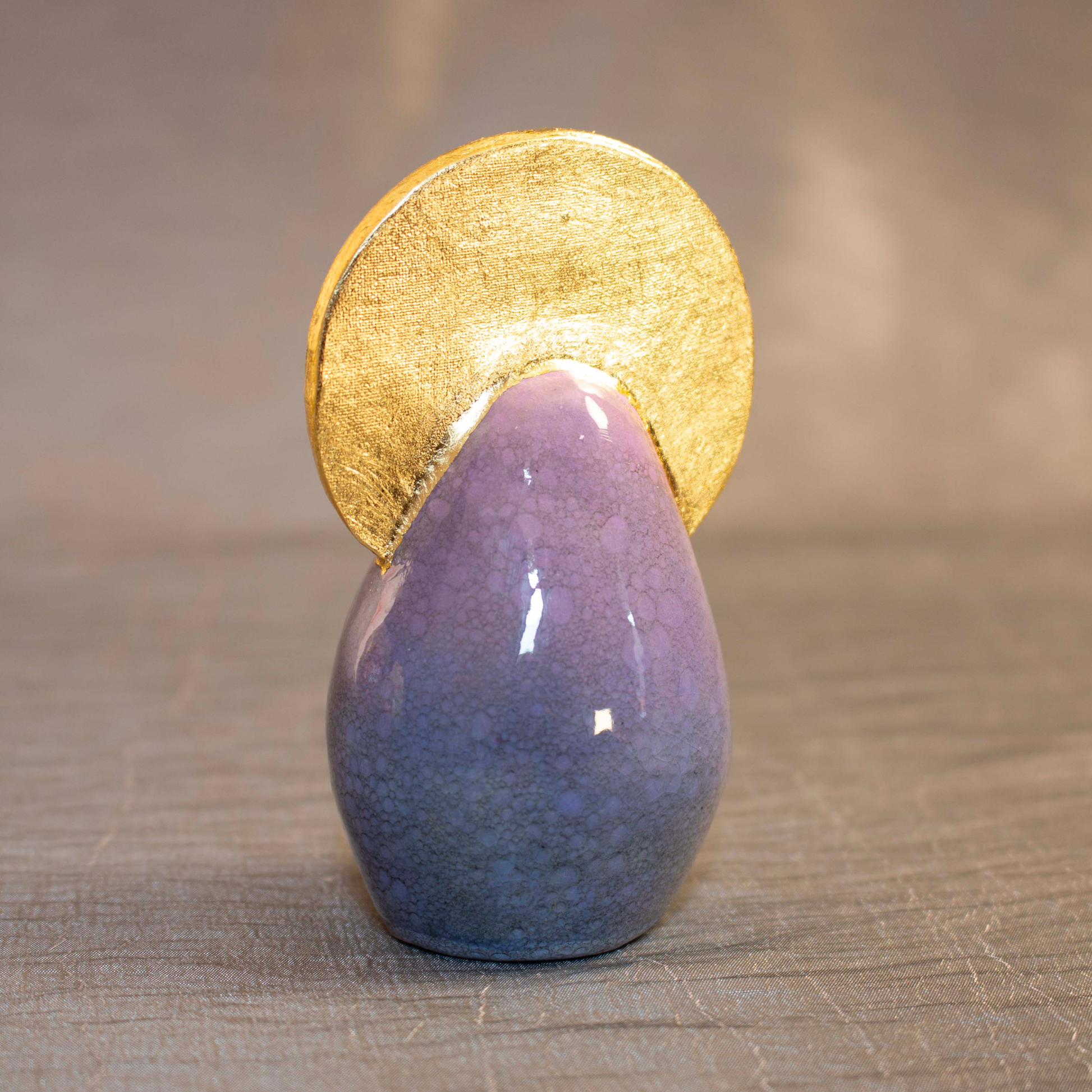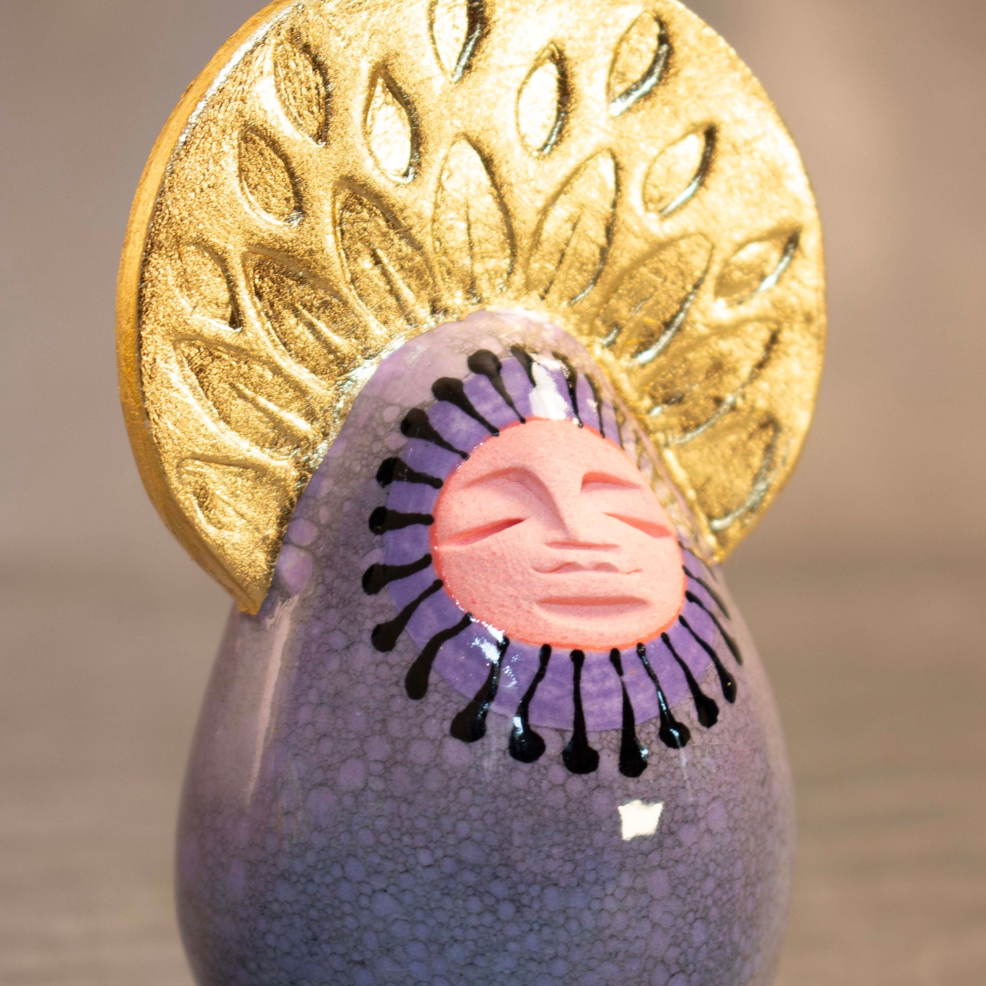 Ceramic Goddess with a pink face, lilac and black detailing and an all over lilac and blue ombre bubble glaze pattern. Her crown features sun rays and leaves.