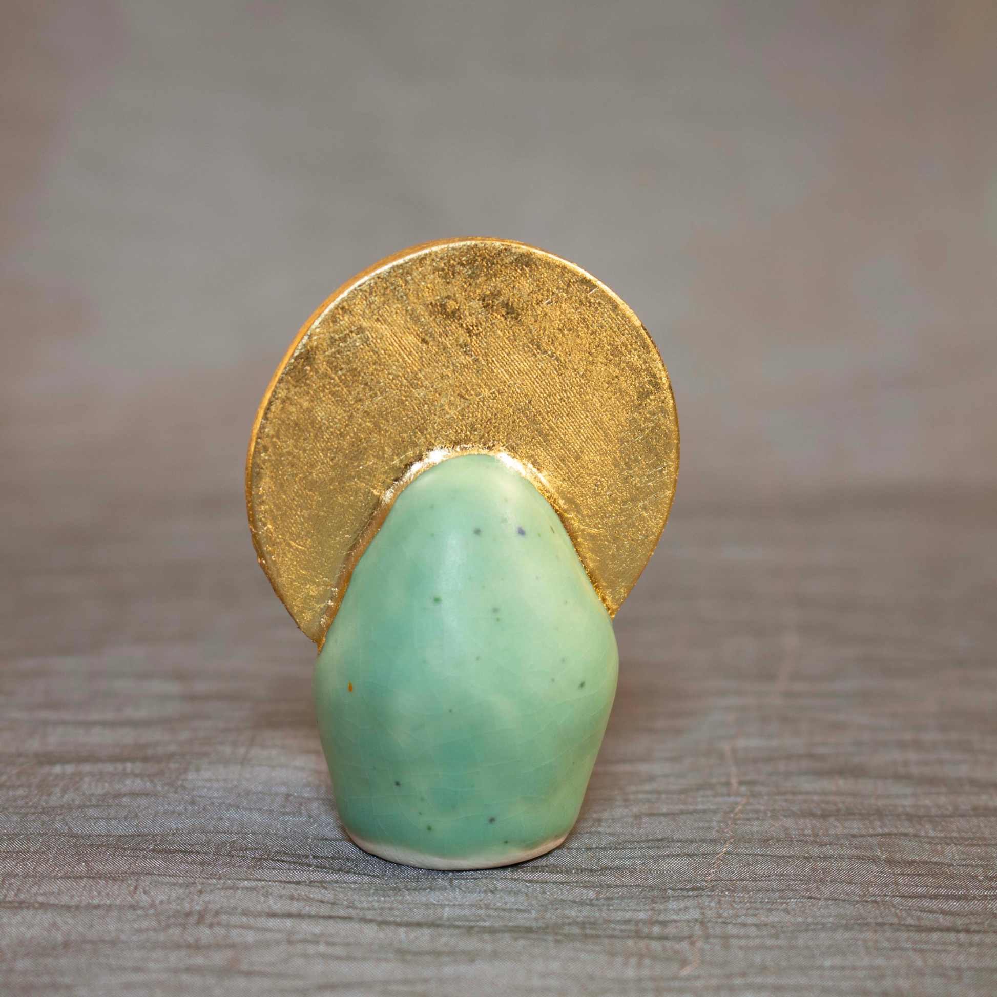 Ceramic Goddess with a turquoise face, black and white detailing and satin robins egg blue glazed body. She has a series of sun rays and tiny stars in her crown.