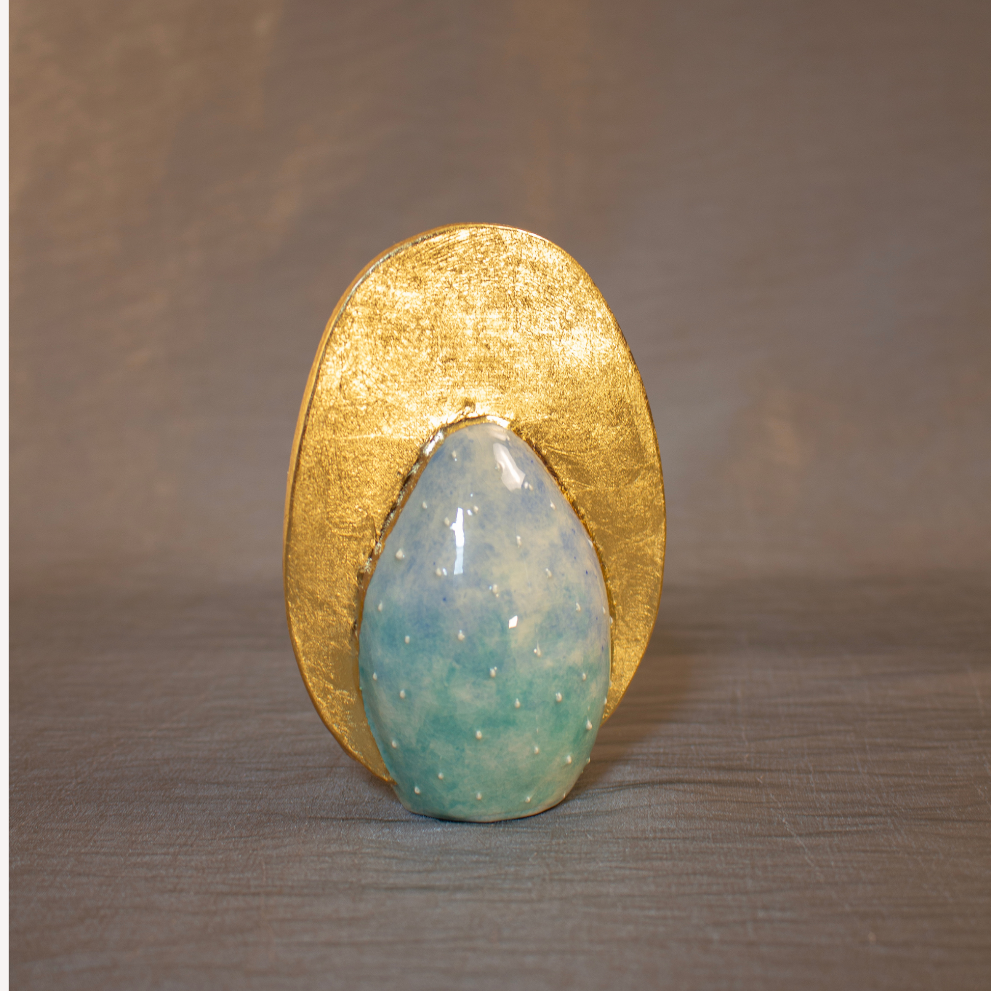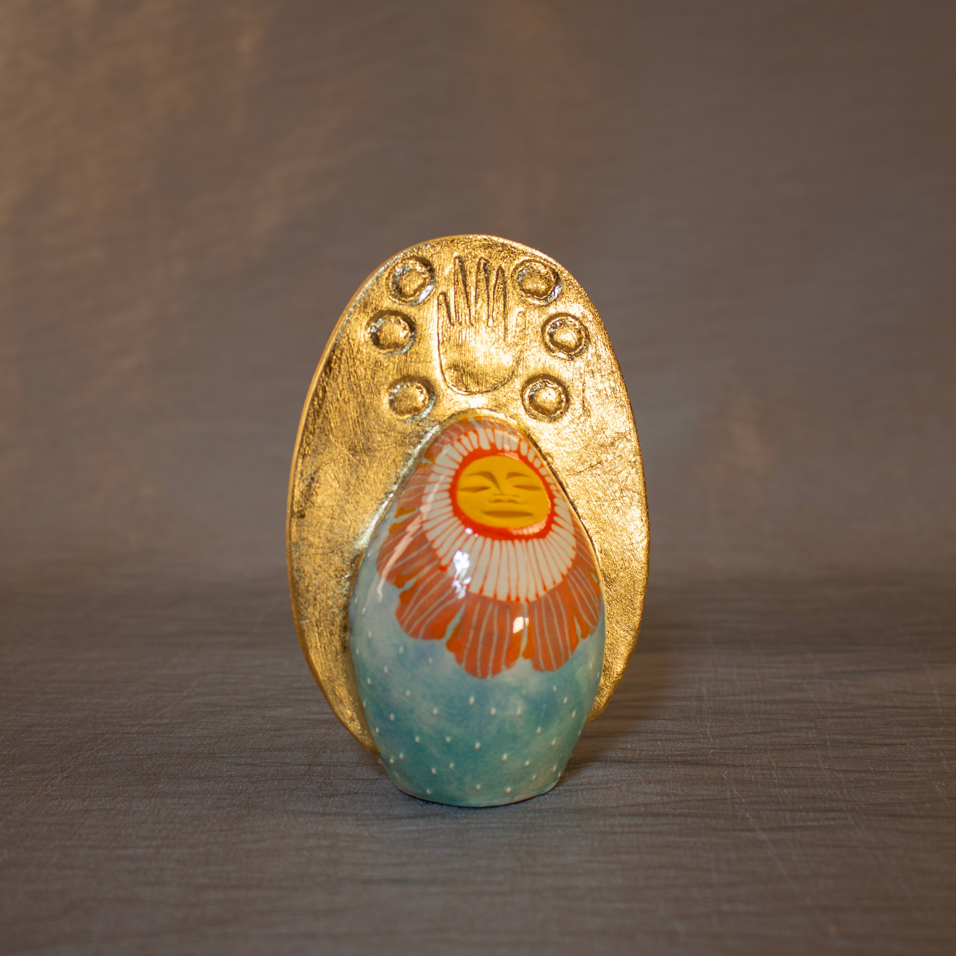 Hand painted ceramic Goddess with yellow face and orange and white flower detailing. She has a delicate mottled blue body with white dot pattern all over. Her crown features a hand surround by six stars.