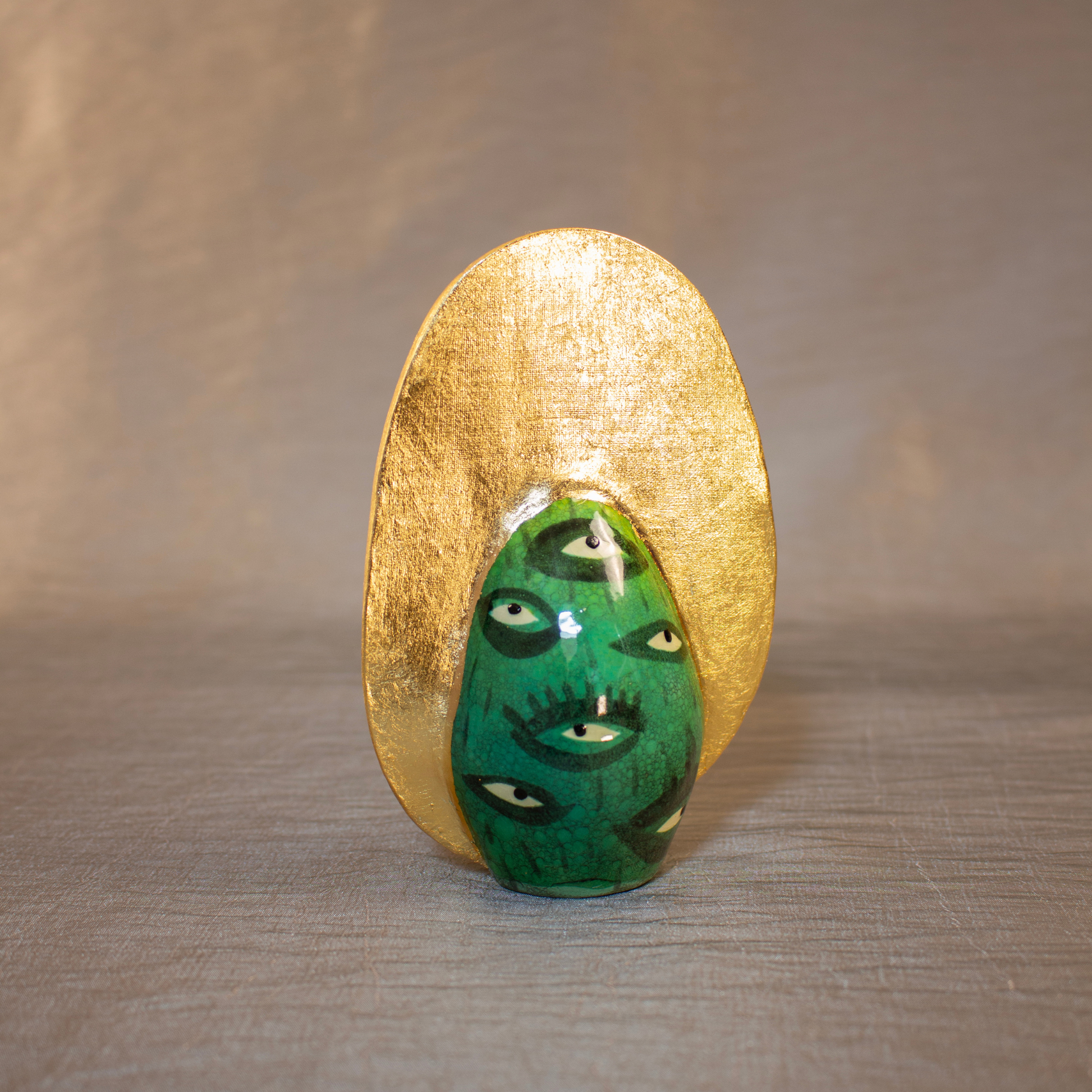 Hand painted ceramic Goddess with teal blue face and an all over green ombre bubble pattern with eyes. Her crown features a hand with a leaf and starbursts.